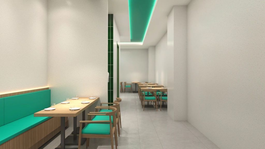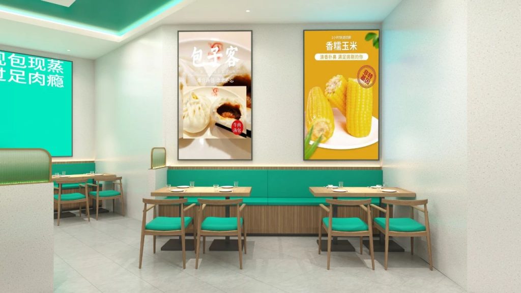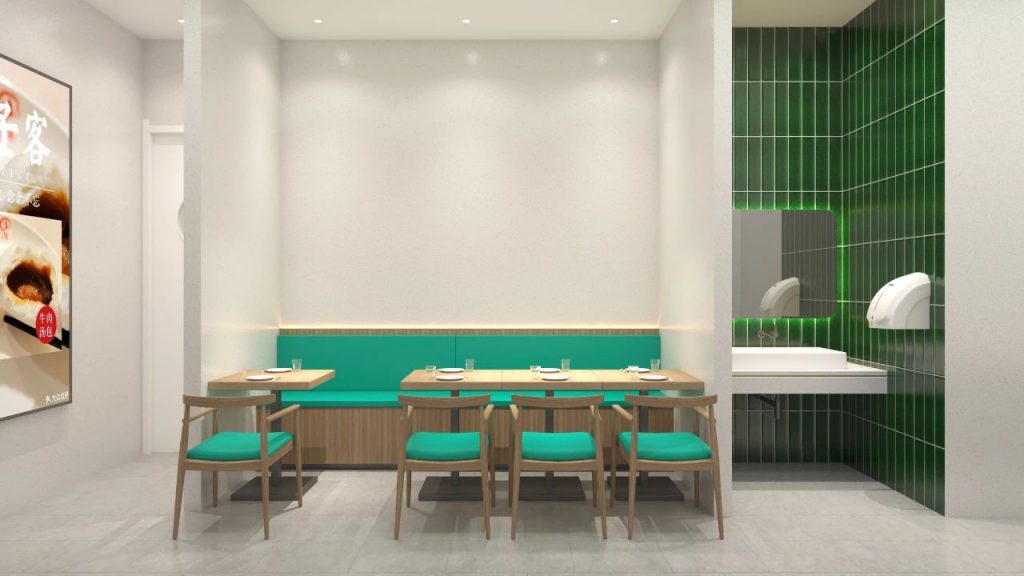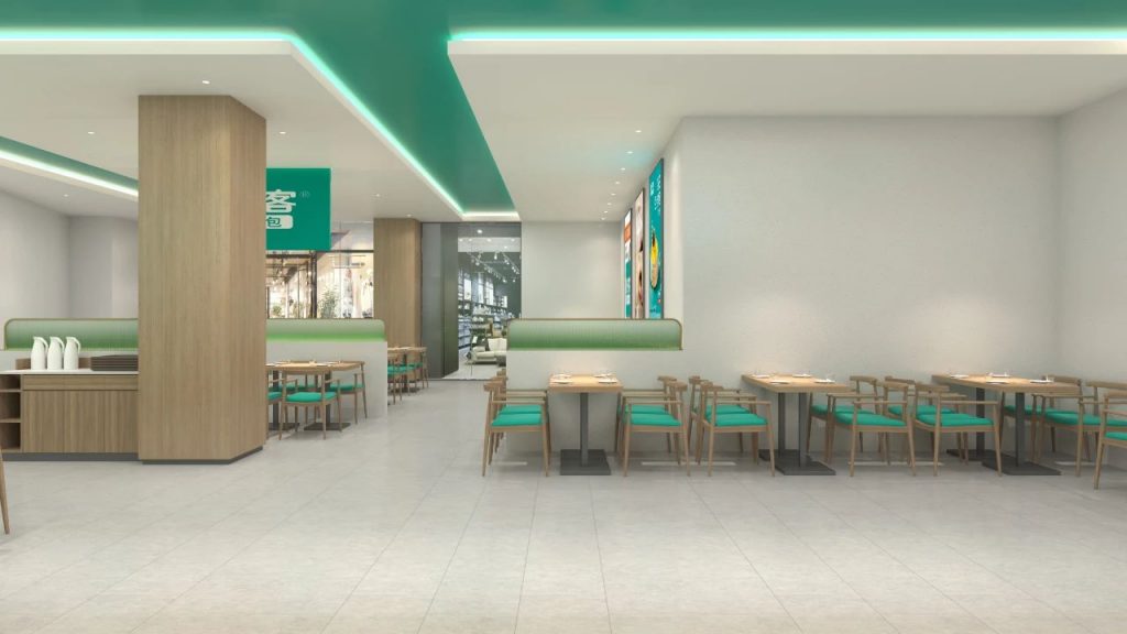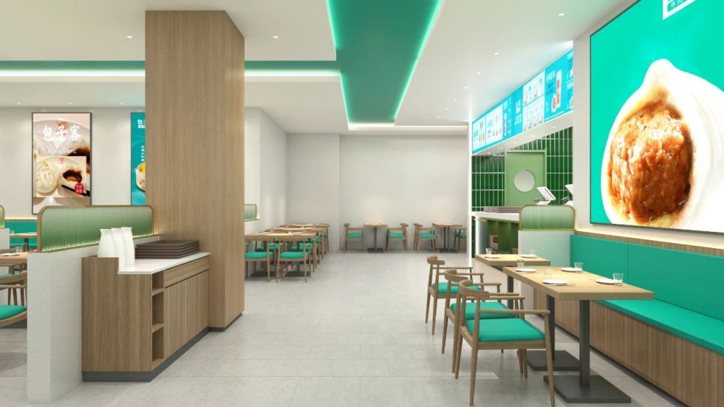 空间内,大面积青白色水磨石质感的墙面使用,搭配包子客独有的品牌色调,既凸显出品牌色增加消费者的记忆点又带来宽敞明亮、干净素雅、静谧舒适的就餐环境感受。