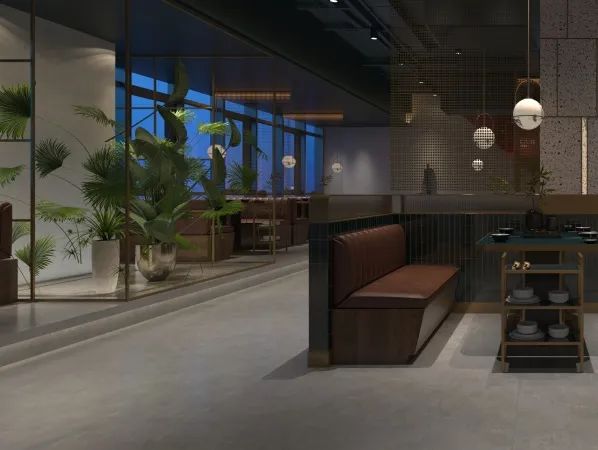 而金色金属条则作为踢脚线、门框、火锅菜品放置架、卡座、餐桌和墙板的收边材料,给整个空间增添了精致轻奢的感觉,简直就是为高端装修量身定制的。餐厅里面还摆满了绿植,给整个空间注入了生机与活力。这些绿植不仅营造出自然的氛围,还为顾客提供了舒适的用餐环境,即使是就餐时刻依然能够感受大自然的美好。