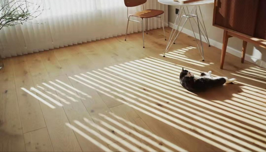 纯实木地板非常好,有着非常高的档次,并且脚感也非常好,但也很娇气。