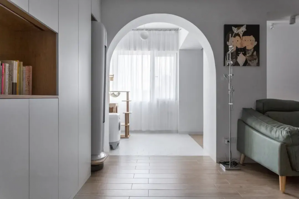 简约风格装修:白色、浅灰色、原木色、米黄色地板;