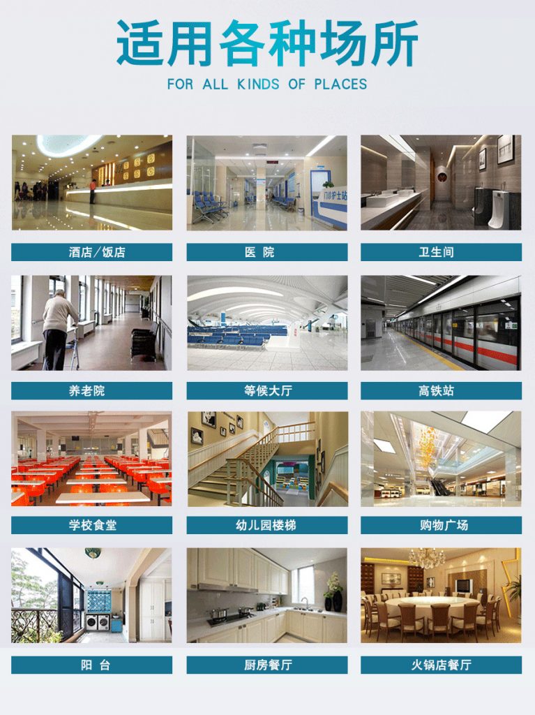 2.块状片材材料防滑地面:防滑型瓷砖地面、防滑型大理石地面、防滑型花岗岩地面、防滑型塑料板地面、橡胶板地面、地板地面(实木、实木复合、中密度复合、竹木、以及我们小蓝鲸品牌的石晶地板)等。
